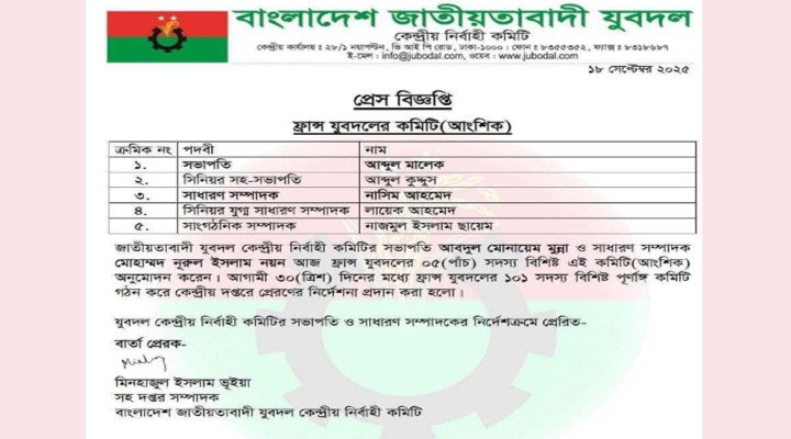 ফ্রান্স যুবদলের সাংগঠনিক কার্যক্রমকে আরও বেগবান করতে একটি নতুন আংশিক কমিটি ঘোষণা করা হয়েছে। বাংলাদেশ জাতীয়তাবাদী যুবদল কেন্দ্রীয় নির্বাহী কমিটির সভাপতি আব্দুল মোনায়েম মুন্না এবং সাধারণ সম্পাদক মোহাম্মদ নূরুল ইসলাম নয়ন এই পাঁচ সদস্য বিশিষ্ট কমিটির অনুমোদন দিয়েছেন।